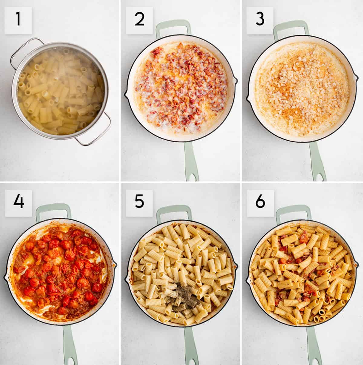 - Bring a large pot of salted water to a boil and cook the rigatoni until al dente, reserving 1 cup of the pasta water before draining, and set aside.