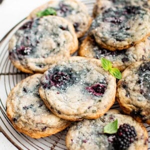 The first time I ever enjoyed blackberry and basil together was in a cocktail. Since that first sip, I’ve been entranced! The way that the juicy, sweet berries and pungent basil come together is a thing of beauty. With this recipe, I took those two oh-so-summery ingredients and turned them into my new favorite homemade cookie. These cookies aren’t too sweet and they have the most satisfying bite – think crispy edges and buttery soft middles that have the best chewy component. Whether you make these for a tea party, Bridgerton viewing party, picnic in the park, or any other sunny soiree you have planned, you’ll be so glad you did!