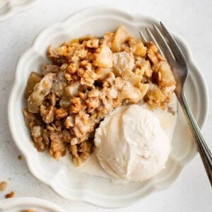 There is just something so homey and cozy to me about serving fall desserts right out of a hot skillet. Of course you can use a regular baking dish as well if you don’t happen to have a skillet (although I highly recommend adding one to your kitchen. They’re so versatile!).