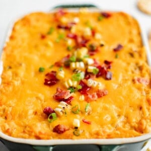 Cheesy, creamy, spicy, and loaded with bacon – this dip really does have it all! If you’re searching for the ultimate game day dip, congrats. You’ve found it! This cheesy buffalo corn dip is always a hit and usually disappears pretty quick at parties. Between the spicy buffalo sauce, sweet corn, and salty bacon, there’s a whole lot to love here! The varying textures are pretty addictive, too. The best part? It all comes together with minimal effort in about 20 minutes. I usually throw it in the oven just before guests arrive as a last minute app when I need something low-stress.