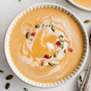 - Serve. Scoop into bowls and garnish with some crumbled bacon, an extra drizzle of heavy cream, a sprinkle of pumpkin seeds, and a bit of fresh thyme. Enjoy!
