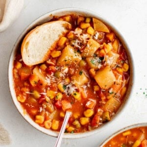 I’ve been making this vegetable soup recipe (or some variant of it) for years now. It’s the definition of tried and true! When it comes to cozy soup recipes to get me through the bitter winters, I’m all about accessibility. That’s why this recipe uses russet potatoes, canned corn, and frozen veggies. You can really think of this recipe as a blueprint – one that’s very open to substitutions. If you need to clear out your produce drawer, freezer, or pantry, this is a great recipe to utilize! Plus, I’ve included instructions for both stove top and slow cooker so you can make this dinner however best fits your plans.