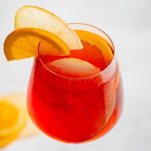 While this recipe is for one drink, making a whole round or a large party pitcher is incredibly easy. The key is keeping the ratio of ingredients the same. A simple way to do this is to multiply by the number of servings you’d like to make. Serving 5? 3 ounces of apple cider is now 15. 2 ounces of aperol? Now you need 10 and so on. Mix everything in a large pitcher or serving bowl without the ice. Serve over ice and garnish as you go. Although you could add the apples and orange slices directly to the pitcher and the fruit will soak up some of the alcohol as it sits! It’s a fun extra treat when you get to the bottom of your glass!
