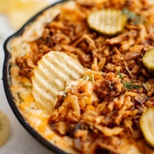 I personally prefer this dip baked in the oven. Since it is a “fried” pickle dip I think it’s best warm but it is still ok cold! If serving cold, I like to still toast the fried onions in a pan with the butter and then add them right before serving the dip.