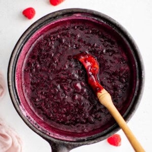 Raspberry sauce is SO good on pancakes like my favorite sheet pan pancakes! I also love it on cheesecake (or super cute mini cheesecakes). It’s even great on some homemade brownies! Most recently, I served it at a party on some angel food cake and it got me more compliments than I could count. On the lighter side, you could stir a spoonful into some plain Greek yogurt for a great morning treat!
