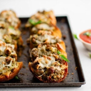 I think this might just be the best way to eat garlic bread. And that’s really saying something, because I love garlic bread any way it’s served to me! But when you pile it high with a pesto and sausage mixture with melty cheese on top, true magic happens. Dip it in some marinara sauce and enjoy the combination of classic Italian flavors! Whether you serve it as an appetizer or even your main course, you’ll be so glad you made this easy recipe. It’s quick, easy, and always gets me a ton of compliments when I serve it. There’s something about pesto and marinara that compliment each other so beautifully!