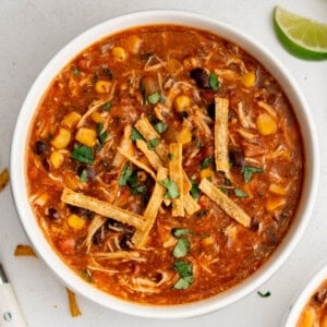 Chicken Enchilada Soup takes everything you love about cheesy, flavorful, protein-packed enchiladas and serves it in a bold soup! The best part? It couldn’t be easier to make – instructions for both slow cooker and instant pot included!