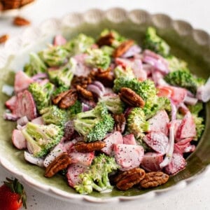 Strawberry broccoli salad is an easy, refreshing salad perfect for spring and summer! Made with fresh broccoli, big juicy strawberries, and candied pecans, all tossed in a light and creamy homemade poppy seed dressing. This salad is sweet and tangy with just a hint of savory. The candied pecans are simple to make yourself and really elevate this dish. I also love throwing together my own salad dressings. They’re quick to make and you can always get the flavor just right to your liking. I love whipping up a big bowl for get togethers in lieu of a traditional salad to keep things unique!