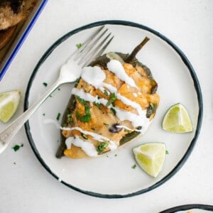 If youโre a fan of recipes like my crockpot stuffed peppers, then youโll love this twist! These stuffed poblano peppers are cheesy and filled to the brim with a protein-packed, flavorful mixture of your favorite Tex-Mex ingredients. This recipe is easily one of my favorite ways to use up shredded chicken. My key to success with this recipe is first roasting the poblanos, which brings out a natural sweetness that balances the savory filling perfectly. And donโt worry about this dinner being too spicy โ poblanos are super mild! Theyโre a little spicier than a bell pepper, but I find that itโs just enough spice to add flavor, not to actually label the dish as spicy.ย