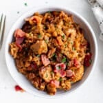 Bacon Ranch Chicken and Rice is an easy, super flavorful, and kid-friendly dinner recipe! Packed full of tender chicken, crisp bacon, ranch seasoning, white rice, and gooey cheese - this one pot meal makes dinner a cinch.