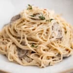 Creamy Mushroom Pasta is one of my favorite meatless entrees! Angel hair pasta is tossed in a decadent parmesan garlic cream sauce with bites of sautéed baby bella mushrooms.