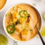 Let it sit for 10 minutes then stir until melted and serve with corn, slices of jalapeños, shredded cheese, sliced green onions, and lime wedges if desired.