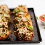 Sausage Pesto Garlic Bread starts with buttery, crunchy garlic bread, then it’s topped with an Italian sausage and pesto mixture before being baked with lots of melty cheese. Served with marinara sauce for dipping, it’s loaded with bold Italian flavors!
