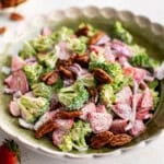 Strawberry Broccoli Salad is a crisp, refreshing salad topped with homemade candied pecans and tossed in a sweet and tangy poppyseed salad dressing made from scratch!